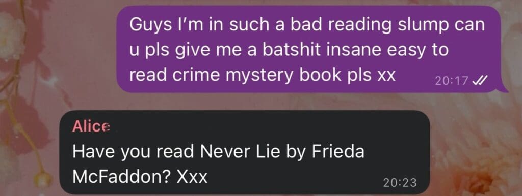 For me, that is the plot twisty thriller genre! Over the last two days I read, finished, and thoroughly enjoyed two Freida McFadden books (Never Lie and Ward D), even though I’m still technically in a slump and I’m not ready to dive back into my usuals yet.